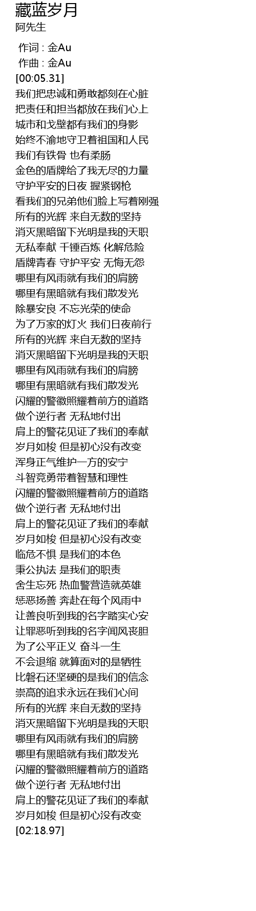 | [00:37.52] | 无私奉献 千锤百炼 化解危险 |
