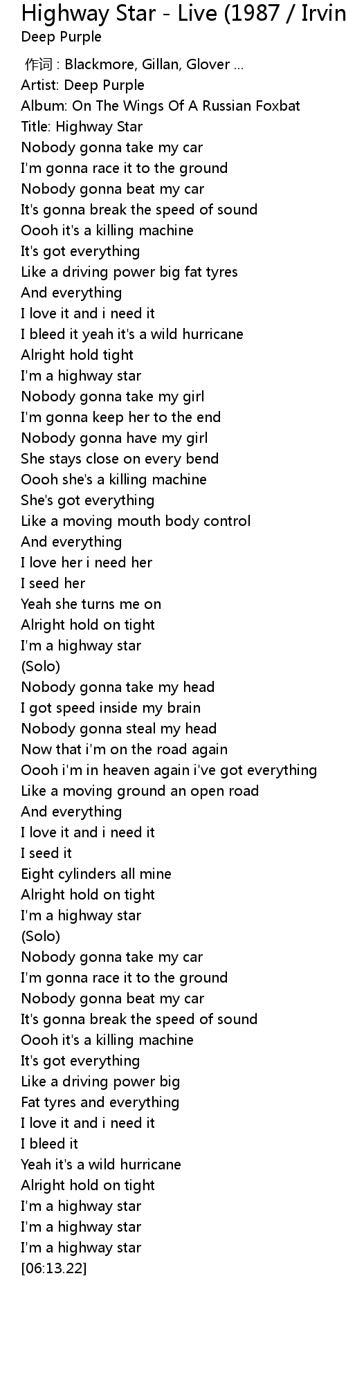 | [06:02.92] | I' m a highway star |