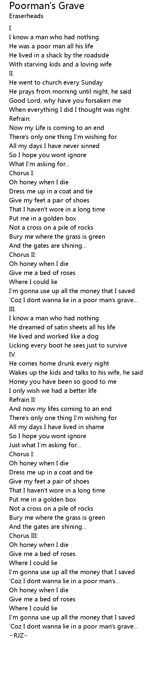 'Coz I dont wanna lie in a poor man's grave... |