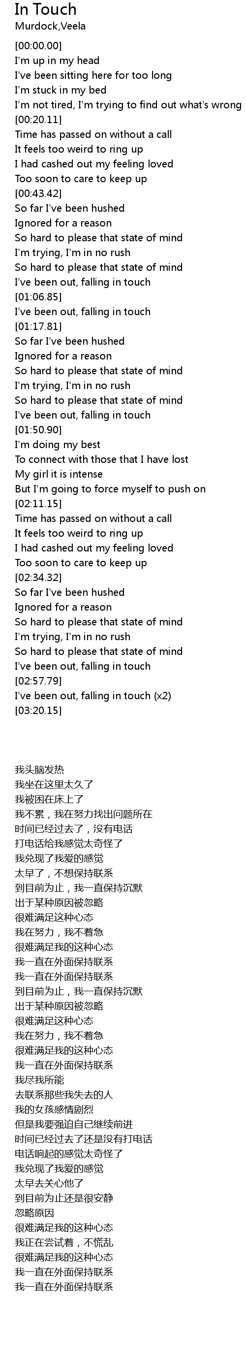 | [03:05.63] | I've been out, falling in touch (x2) |