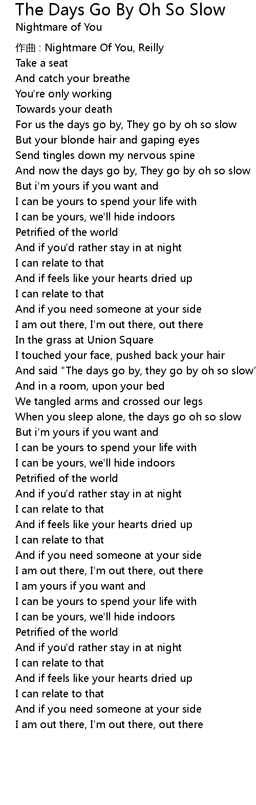 | And now the days go by, They go by oh so slow | |