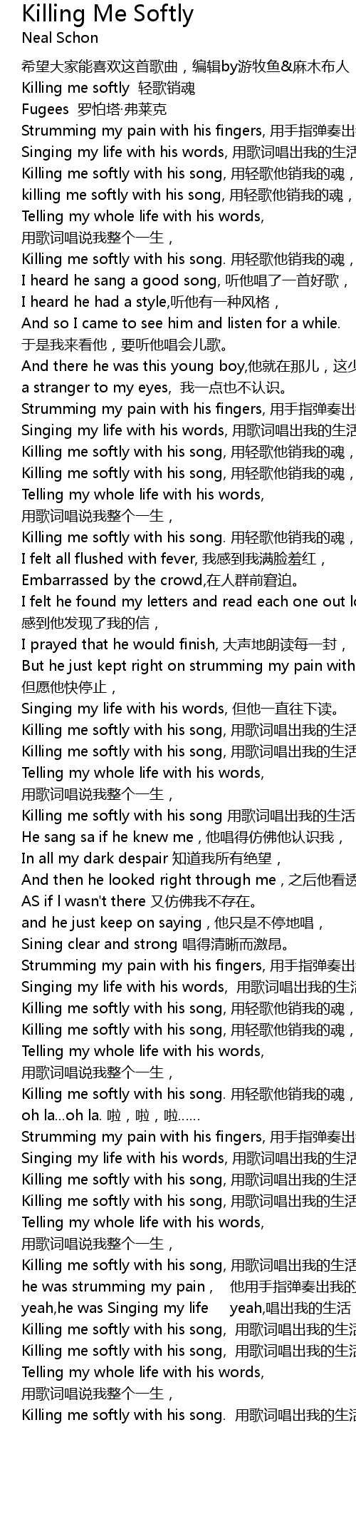| [04:34.21] | Killing me softly with his song. 用歌词唱出我的生活, |