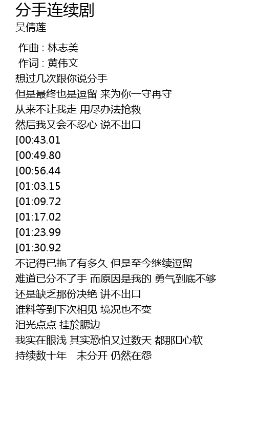 | [03:04.50][01:30.92] | 时日再顺延 让分手 遗留伏线 |