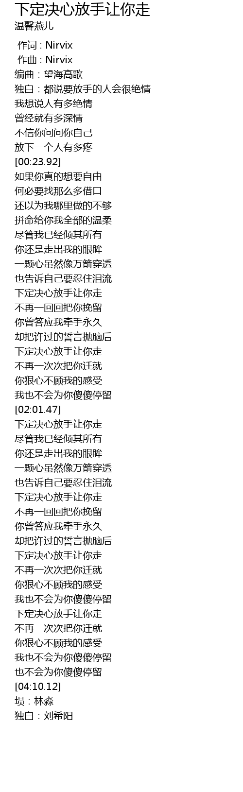 | [03:37.30] | xià dìng jué xīn fàng shǒu ràng nǐ zǒu |