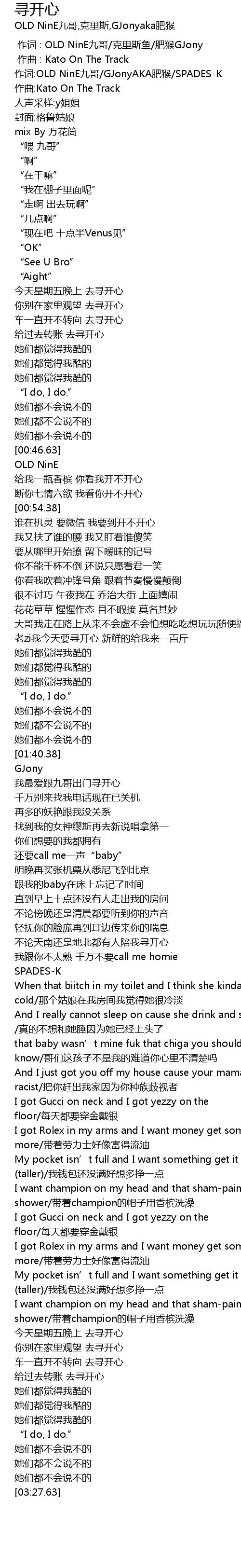 | [00:00.88] | 作词:OLD NinE九哥/GJonyAKA肥猴/SPADES-K |