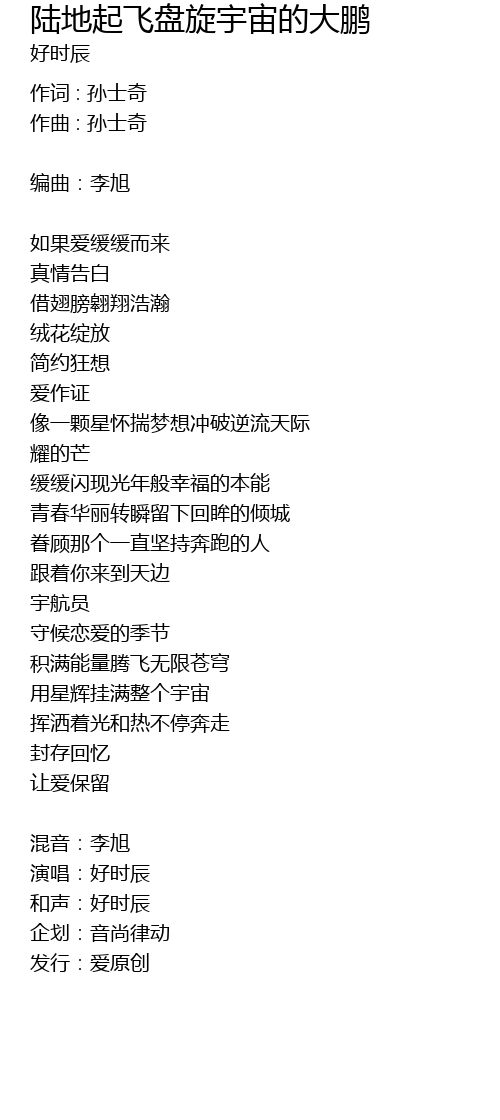 | Song | 陆地起飞盘旋宇宙的大鹏 |