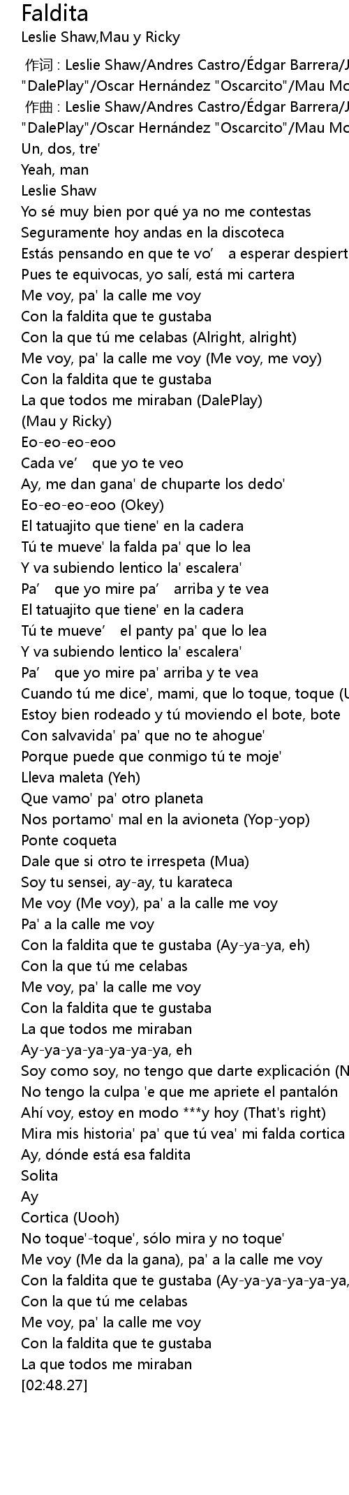 | [02:17.43] | Mira mis historia' pa' que tú vea' mi falda cortica |