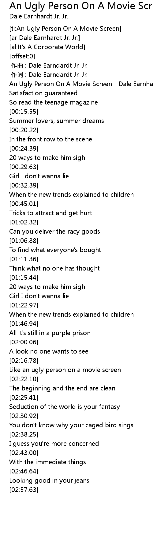 | [00:00.75] | An Ugly Person On A Movie Screen Dale Earnhardt Jr. Jr. |