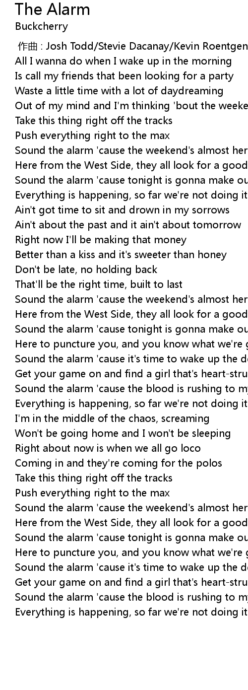 | [00:36.114] | Sound the alarm 'cause the weekend's almost here |