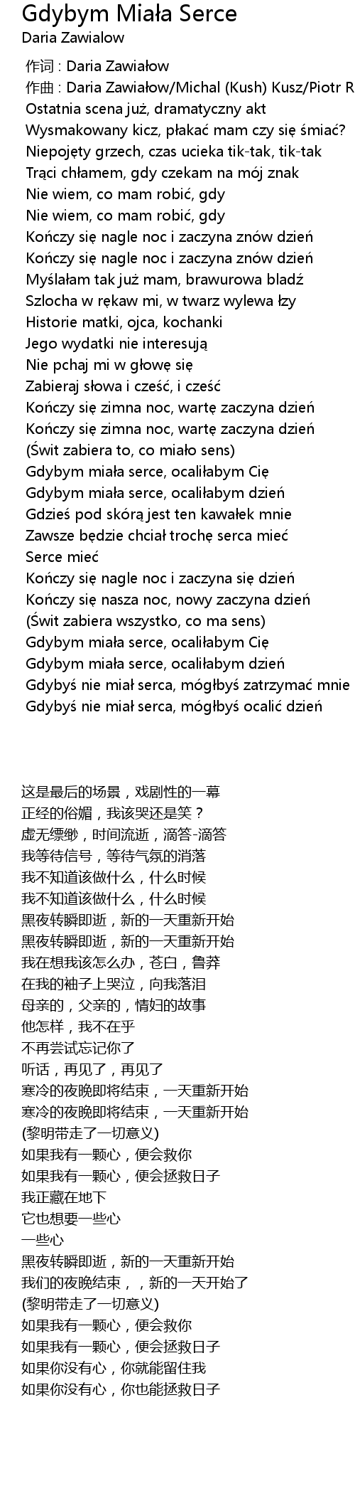 | [00:01.000] | zuò qǔ : Daria Zawia ow Michal Kush Kusz Piotr Rubik |