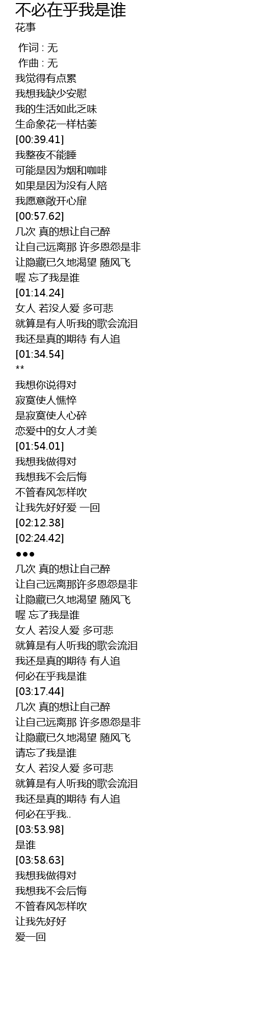 | [03:13.16] | hé bì zài hu wǒ shì shuí |