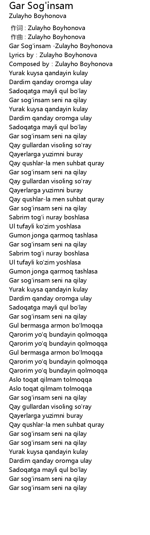 | [00:00.397] | Gar Sog'insam -Zulayho Boyhonova |