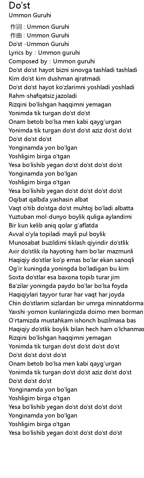 | [02:38.360] | Yonimda tik turgan do' st do' st do' st do' st |