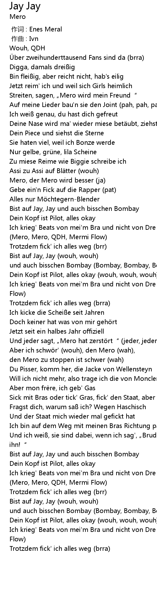 | [01:14.98] | Und jeder sagt, Mero hat zerst rt" jeder, jeder, jeder |