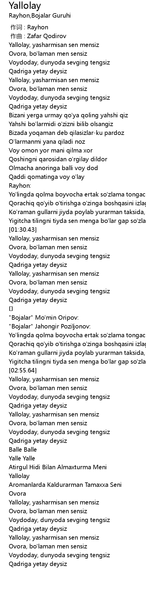 | [02:55.92] | Yallolay, yasharmisan sen mensiz |