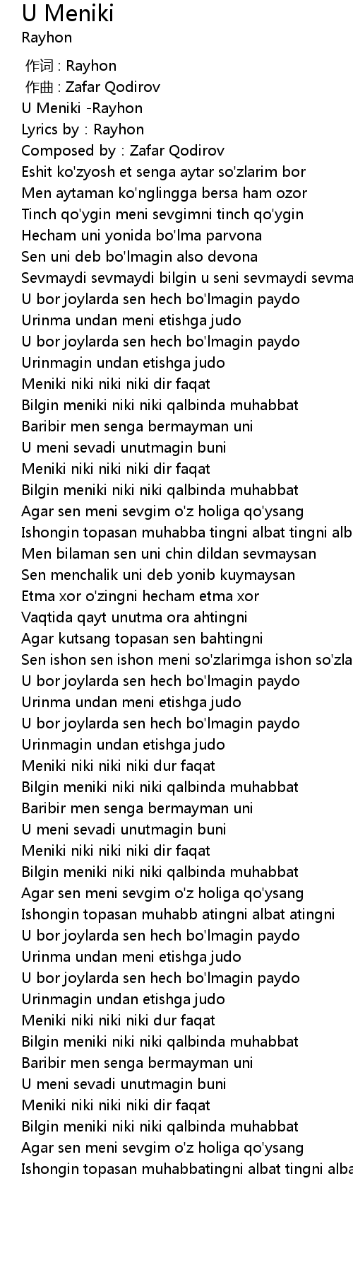 | [00:00.133] | U Meniki -Rayhon |