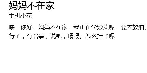| 喂、你好、妈妈不在家、我正在学炒菜呢、要先放油、放菜、翻炒、再翻炒、出锅。 | |