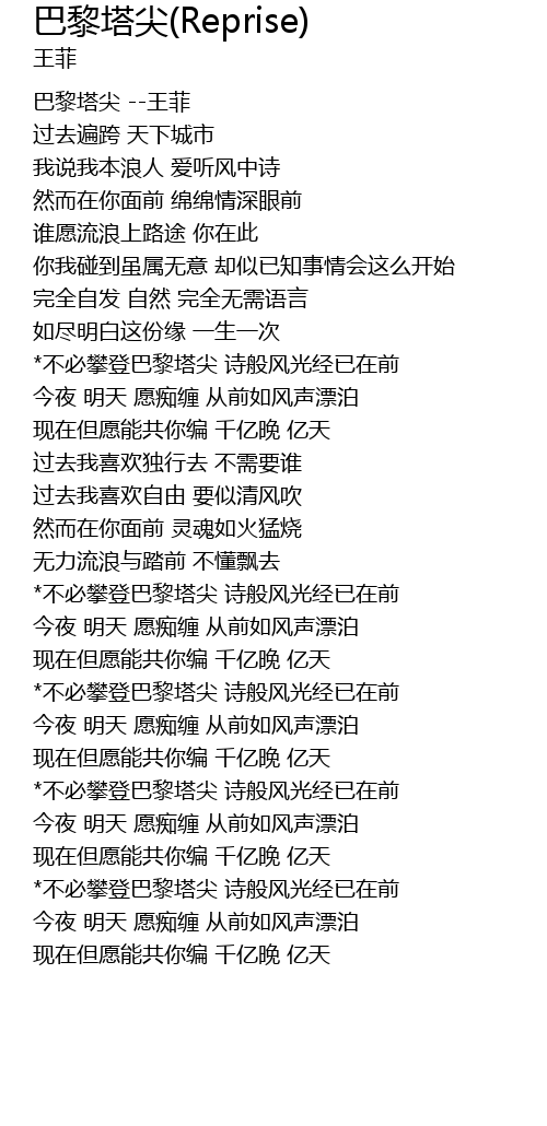 | [00:02.00] | 巴黎塔尖 --王菲 |
