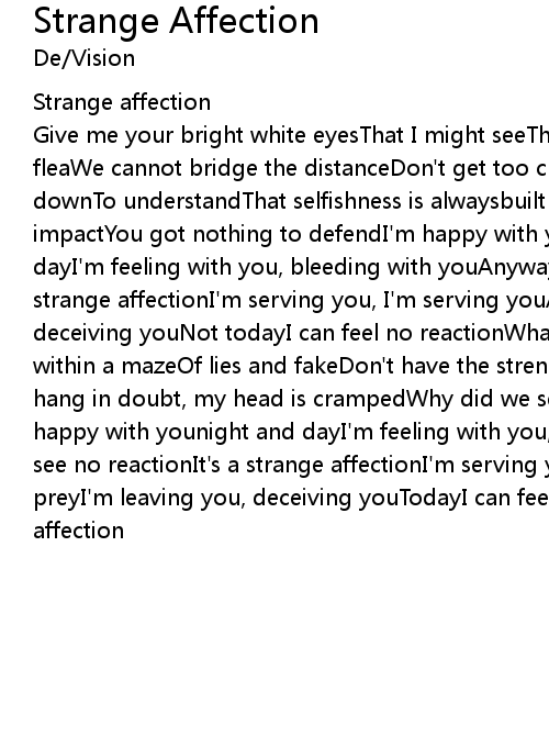 Give me your bright white eyesThat I might seeThe blindness of a narrow-minded fleaWe cannot bridge the distanceDon't get too close to meHow deep must you fall downTo understandThat selfishness is alwaysbuilt on sandWaiting for the impactYou got nothing to defendI'm happy with you, happy with younight and dayI'm feeling with you, bleeding with youAnywayI can see no reactionIt's a strange affectionI'm serving you, I'm serving youAs a preyI'm leaving you, deceiving youNot todayI can feel no reactionWhat a strange affectionI'm trapped within a mazeOf lies and fakeDon't have the strength to speak,to fight or hateI hang in doubt, my head is crampedWhy did we seek the endI'm happy with you, happy with younight and dayI'm feeling with you, bleeding with youAnywayI can see no reactionIt's a strange affectionI'm serving you, I'm serving youAs a preyI'm leaving you, deceiving youTodayI can feel no reactionWhat a strange affection |