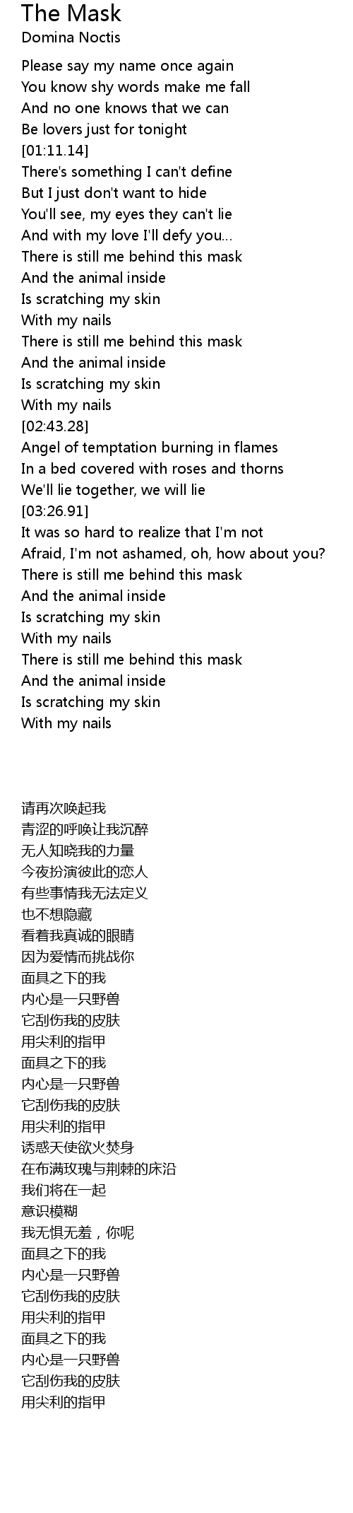 | [02:23.43] | There is still me behind this mask |