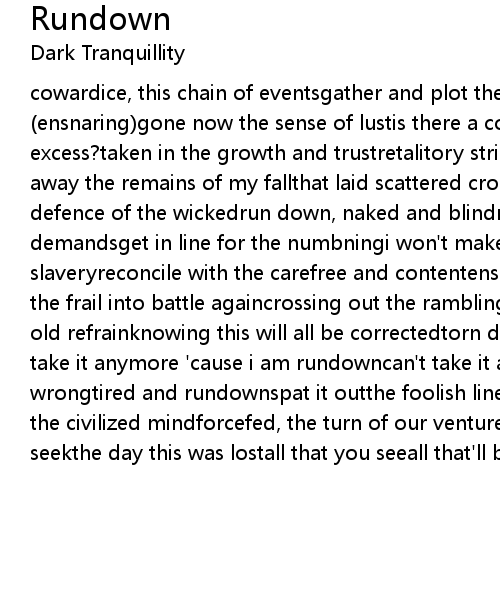 cowardice, this chain of eventsgather and plot the ensnaring of me (ensnaring)gone now the sense of lustis there a cost for the reckless excess?taken in the growth and trustretalitory strike at the weakest spotraked away the remains of my fallthat laid scattered cross plains of regrethumble in defence of the wickedrun down, naked and blindmerciless, the onslaught of demandsget in line for the numbningi won't make a standredeemer of the slaveryreconcile with the carefree and contentensnarer, caretakerlead not these the frail into battle againcrossing out the ramblings of otherstired of the same old refrainknowing this will all be correctedtorn down, wasted and losti can't take it anymore 'cause i am rundowncan't take it anymore 'cause this is wrongtired and rundownspat it outthe foolish lines you fedit holds a place in the civilized mindforcefed, the turn of our venturesome questbeing rundown as we seekthe day this was lostall that you seeall that'll berundown |