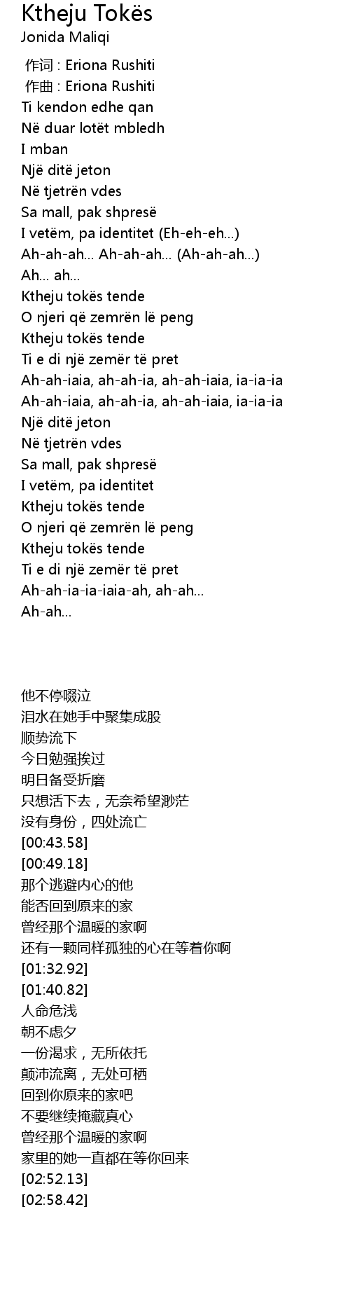 | [00:00.000] | 作词 : Eriona Rushiti |
