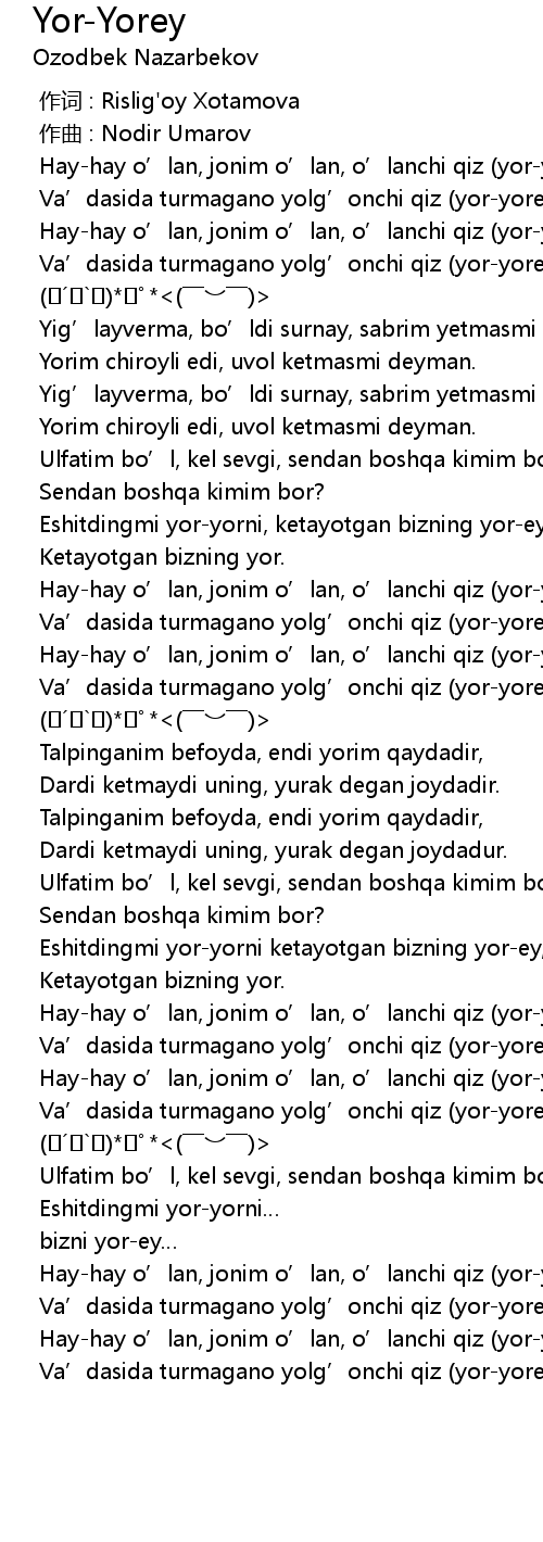 | [02:34.987] | Hayhay o' lan, jonim o' lan, o' lanchi qiz yoryorey, |