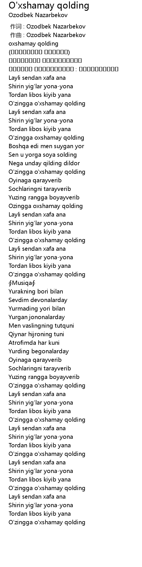 | [00:00.000] | 作词 : Ozodbek Nazarbekov |