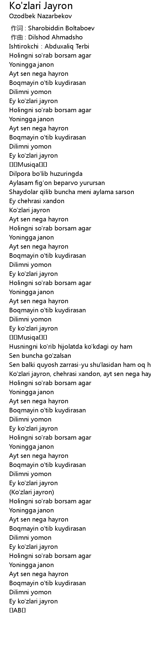 | [00:00.000] | 作词 : Sharobiddin Boltaboev |