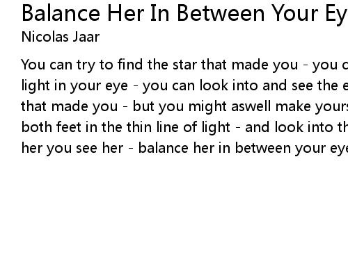 | You can try to find the star that made you - you can try to find that speck of light in your eye - you can look into and see the eye that made you - the light that made you - but you might aswell make yourself at home balance at home - put both feet in the thin line of light - and look into the eye that made you - tell her you see her - balance her in between your eyes(Dank an trent für den Text) |