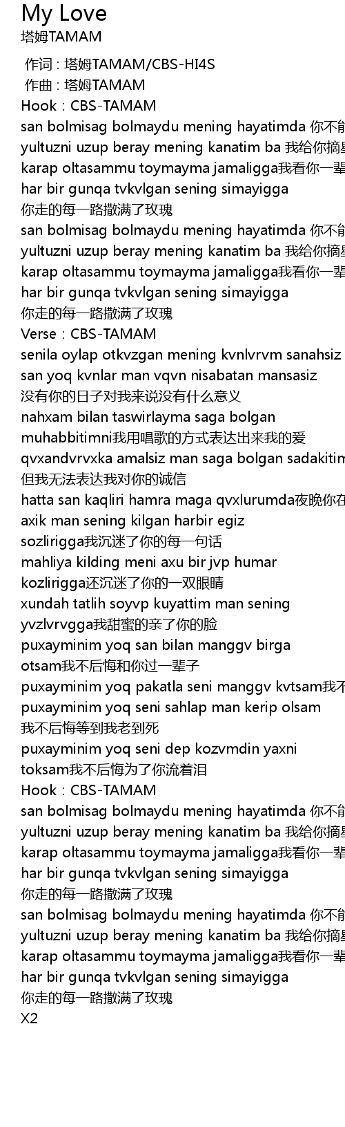 | [01:43.285] | san bolmisag bolmaydu mening hayatimda nǐ bù néng bù zài wǒ shēn biān |