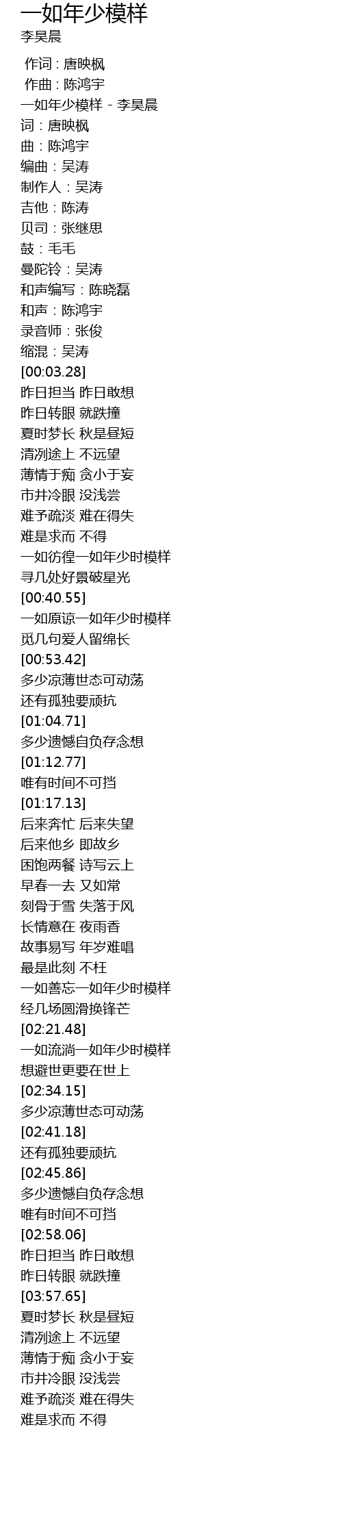 | [00:00.22] | 一如年少模样 - 李昊晨 |