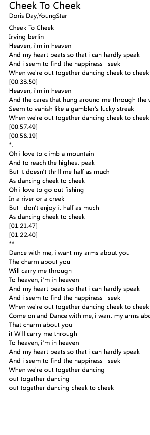 | [00:52.52] | When we're out together dancing cheek to cheek |