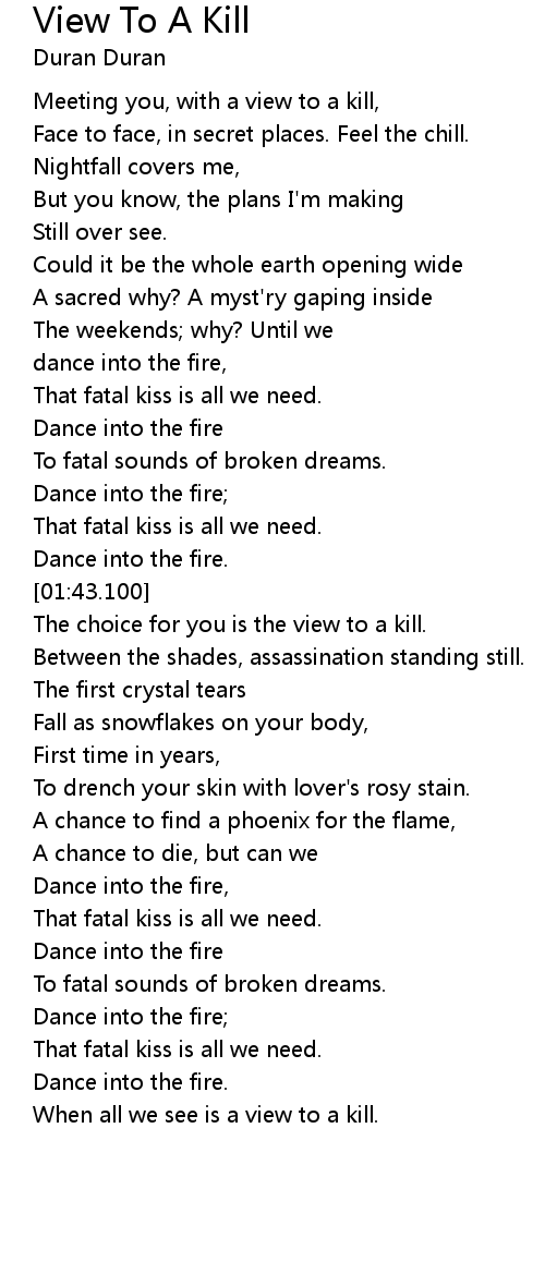 | [00:20.100] | Meeting you, with a view to a kill, |