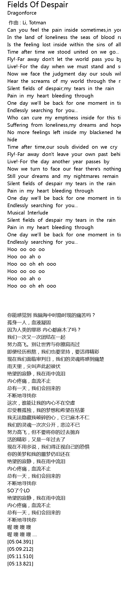 | [04:39.996] | Silent fields of despair my tears in the rain |