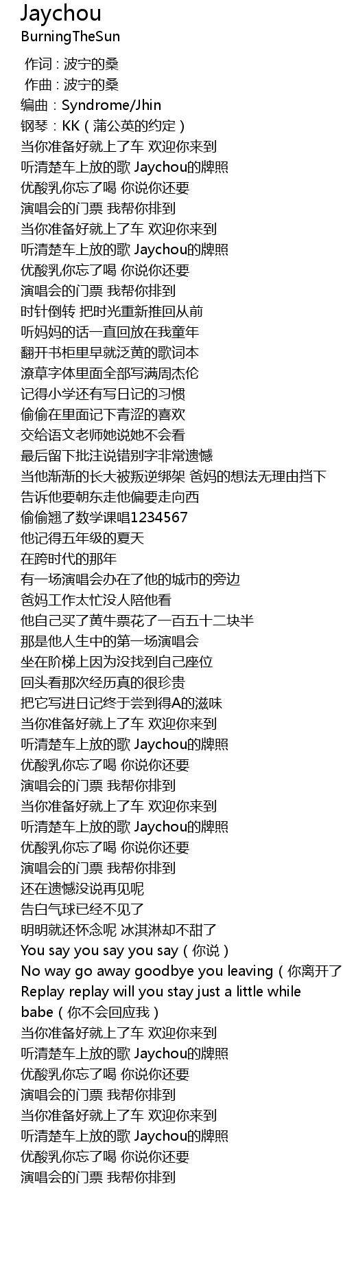| [02:43.384] | 听清楚车上放的歌 Jaychou的牌照 |