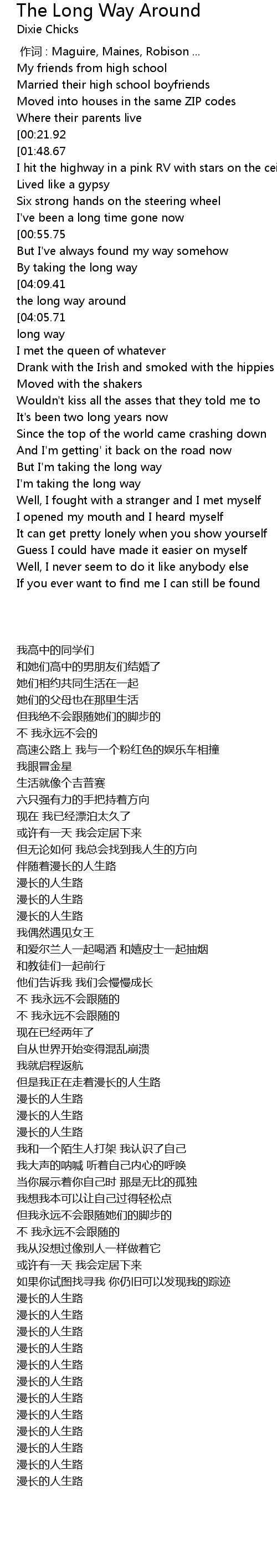 | [04:16.91][04:09.41][04:01.94][03:54.40][03:46.95][03:39.40][02:18.83][02:11.26][01:15.04][01:07.55] | Taking the long way around |