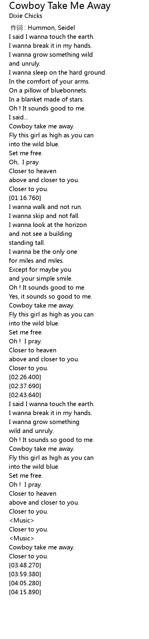 | [03:06.270] | Cowboy take me away. |