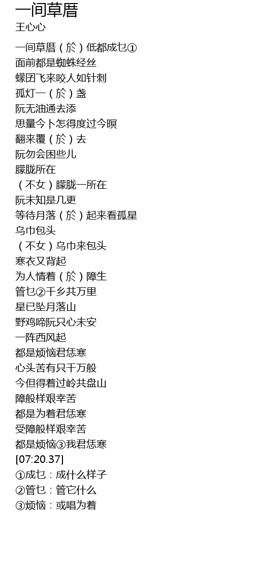 | [00:10.12] | 一间草厝(於)低都成乜① |