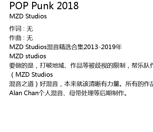 | (MZD Studios 混音之道)好混音,本来就该清晰有力量。所有的作品均为Jerome Alan Chan个人混音、母带处理等后期制作。 |