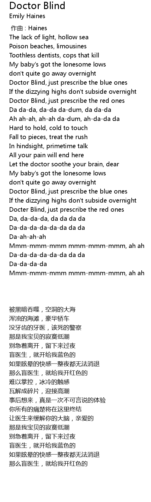 | [02:12.850] | Doctor Blind, just prescribe the blue ones |