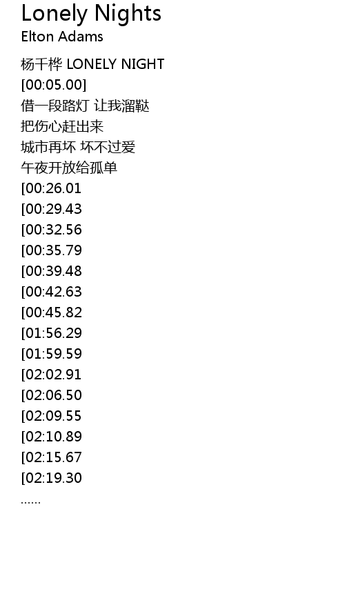 | [00:00.00] | 杨千桦 LONELY NIGHT |