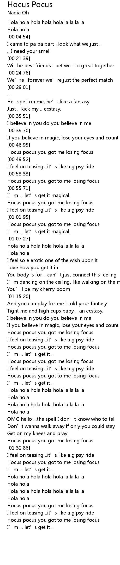 | [00:58.58] | Hocus pocus you got me losing focus |