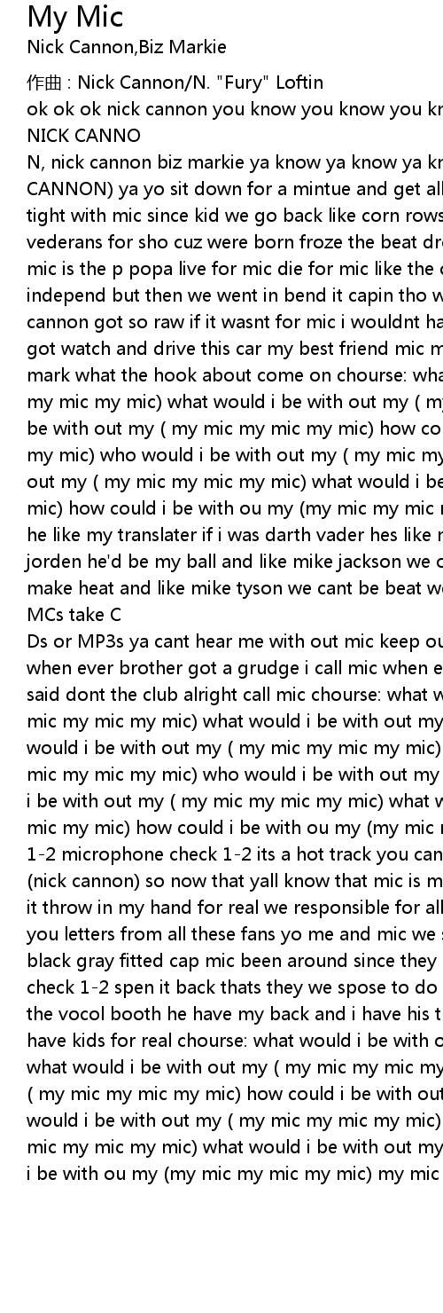 | N, nick cannon biz markie ya know ya know ya know nick cannon biz markie NICK CANNON ya yo sit down for a mintue and get all up in my mix let tell you i been tight with mic since kid we go back like corn rows perform shows we do it like vederans for sho cuz were born froze the beat dropa only thing between me and mic is the p popa live for mic die for mic like the cheif rocka we did it independ but then we went in bend it capin tho what happen tho were rappen yo cannon got so raw if it wasnt for mic i wouldnt have this far how you thing i got watch and drive this car my best friend mic my man be lookin out yo ask biz mark what the hook about come on chourse: what would i be with out my my mic my mic my mic what would i be with out my my mic my mic my mic what would i be with out my my mic my mic my mic how could i be with out my my mic my mic my mic who would i be with out my my mic my mic my mic what would i be with out my my mic my mic my mic what would i be with out my my mic my mic my mic how could i be with ou my my mic my mic my mic nick cannon my man mic he like my translater if i was darth vader hes like my lightsaber if was mike jorden he' d be my ball and like mike jackson we off the wall and like mic man we make heat and like mike tyson we cant be beat we eat | |