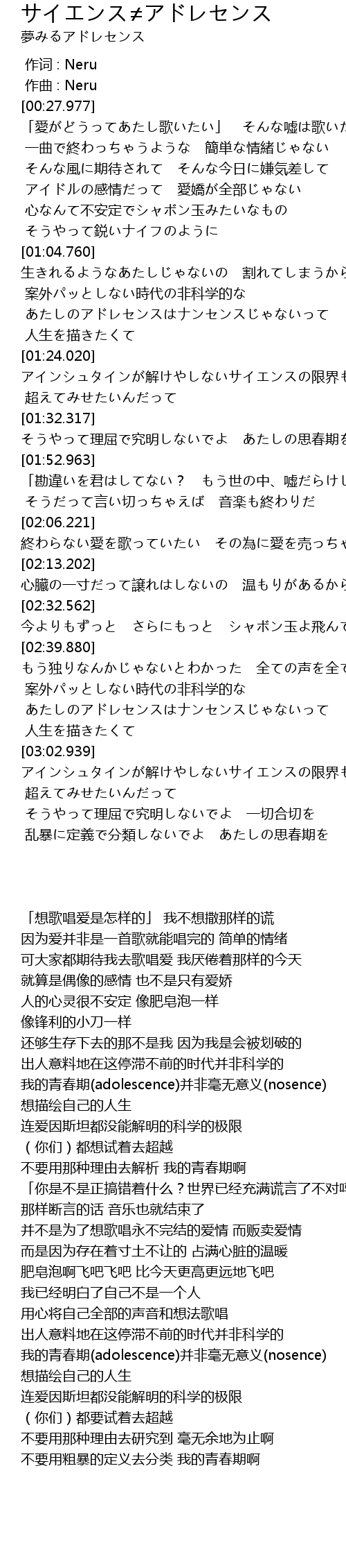 | [02:54.428] | あたしのアドレセンスはナンセンスじゃないって |