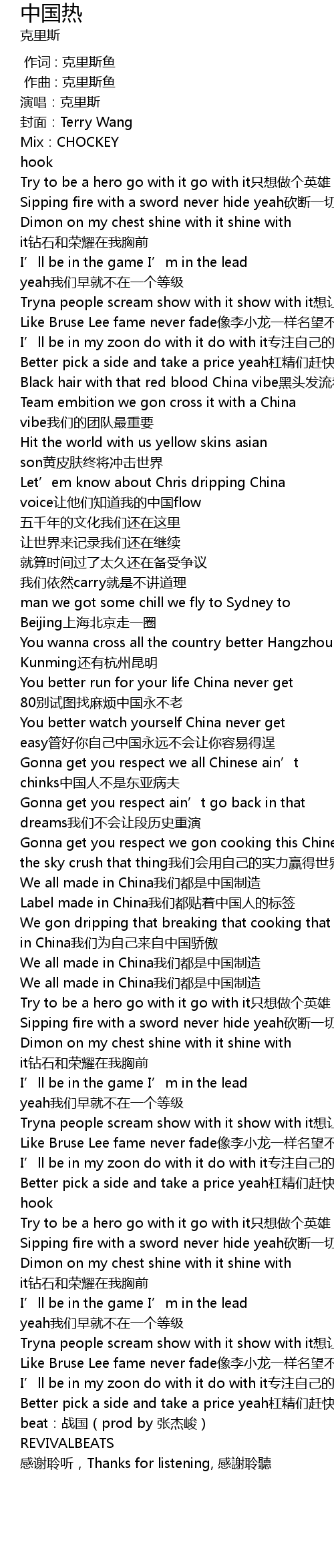 | [00:45.318] | Let' em know about Chris dripping China voice rang ta men zhi dao wo de zhong guo flow |