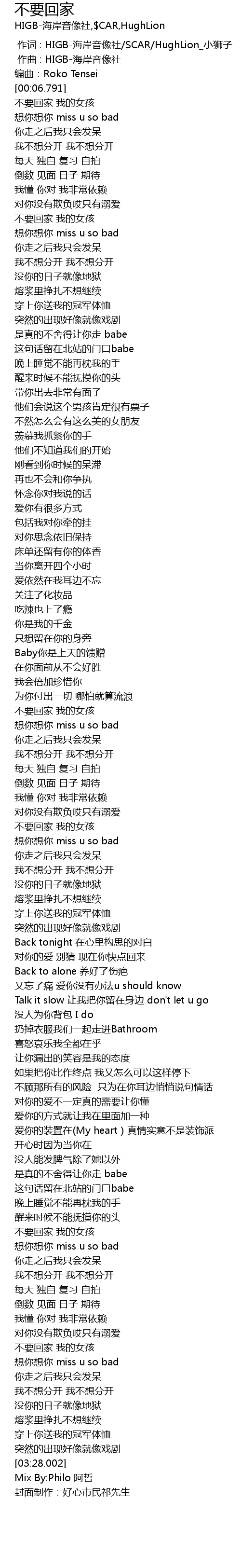 | [03:15.082] | xiǎng nǐ xiǎng nǐ miss u so bad |