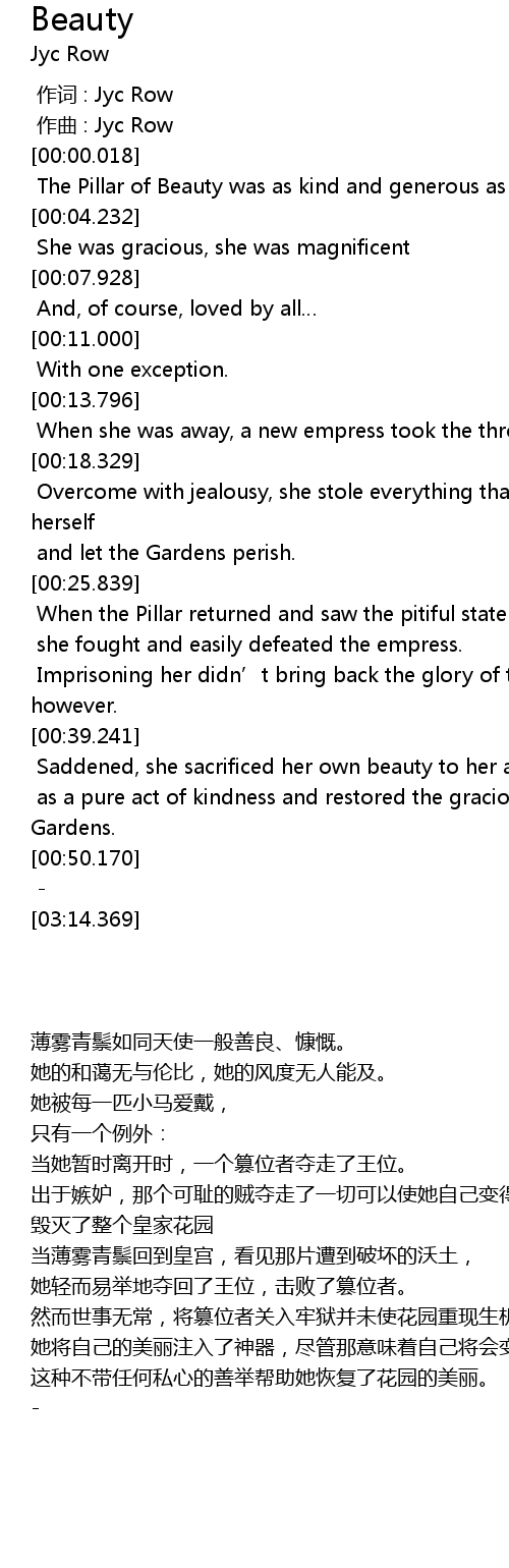| [00:00.634] | The Pillar of Beauty was as kind and generous as an angel. |