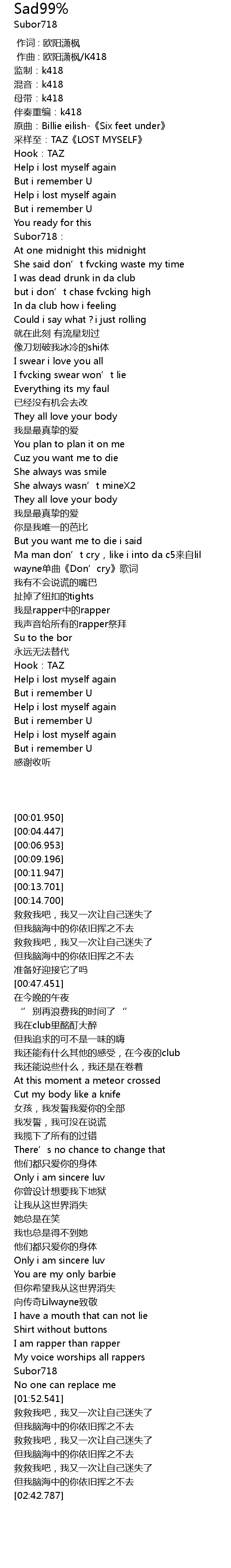 | [00:13.701] | cǎi yàng zhì: TAZ LOST MYSELF |