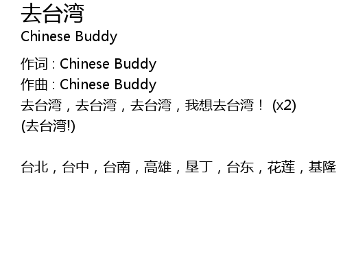| qù tái wān, qù tái wān, qù tái wān, wǒ xiǎng qù tái wān! x2 | |